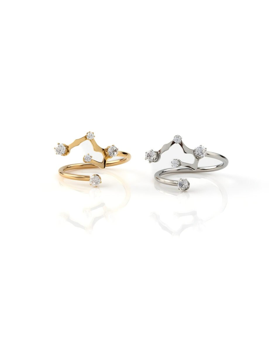 Com linhas suaves e harmonia entre os elementos, este anel reflete a estabilidade e sofisticação da mulher de Touro. A constelação é representada por pequenos cristais que captam subtilmente a luz, evocando a beleza da noite. Disponível em dourado ou prateado, é uma peça que transmite equilíbrio, bom gosto e autenticidade.