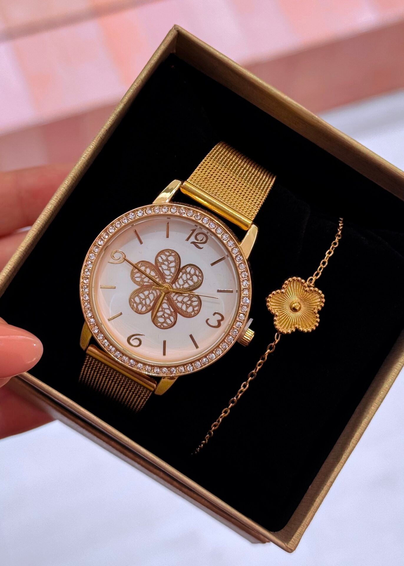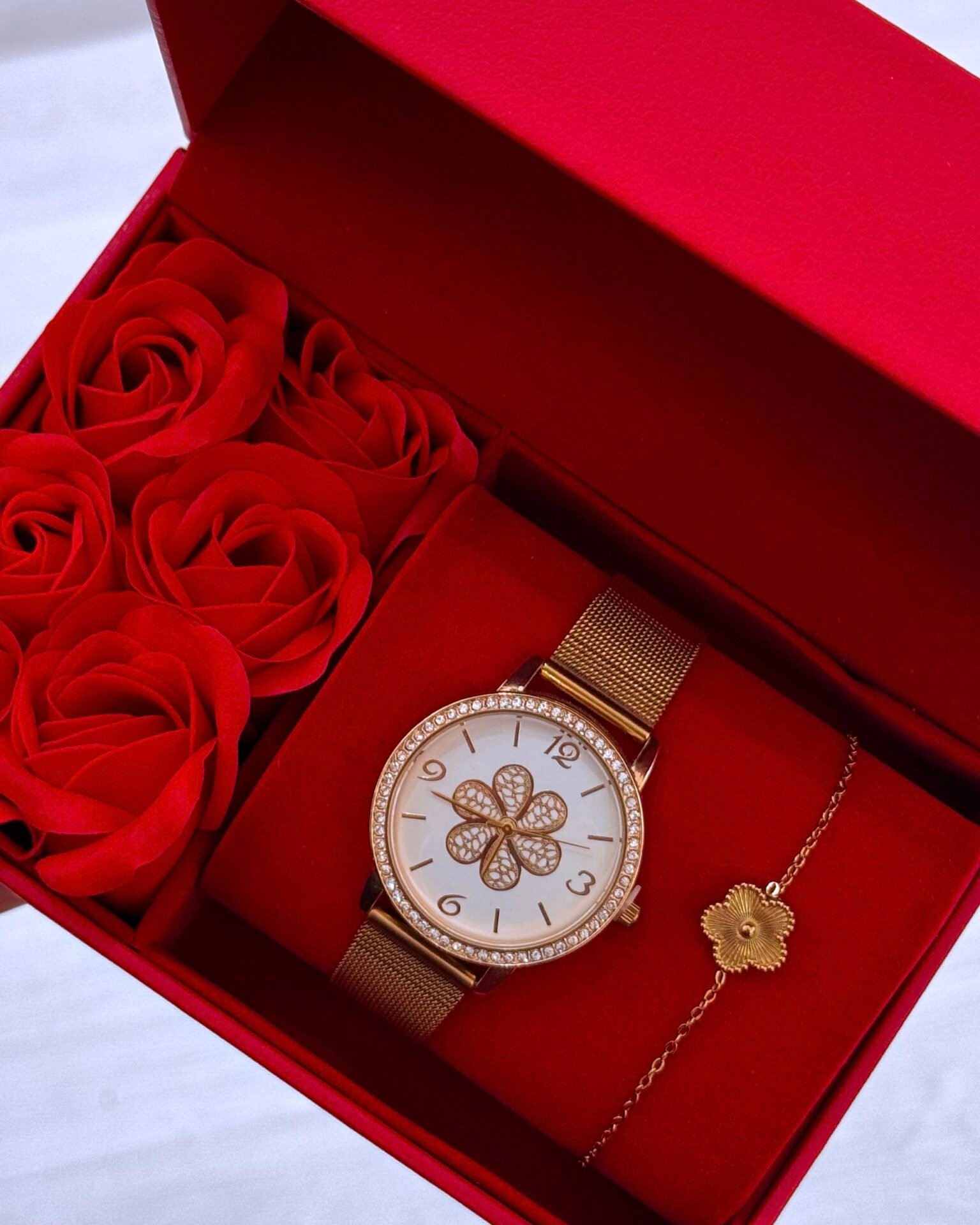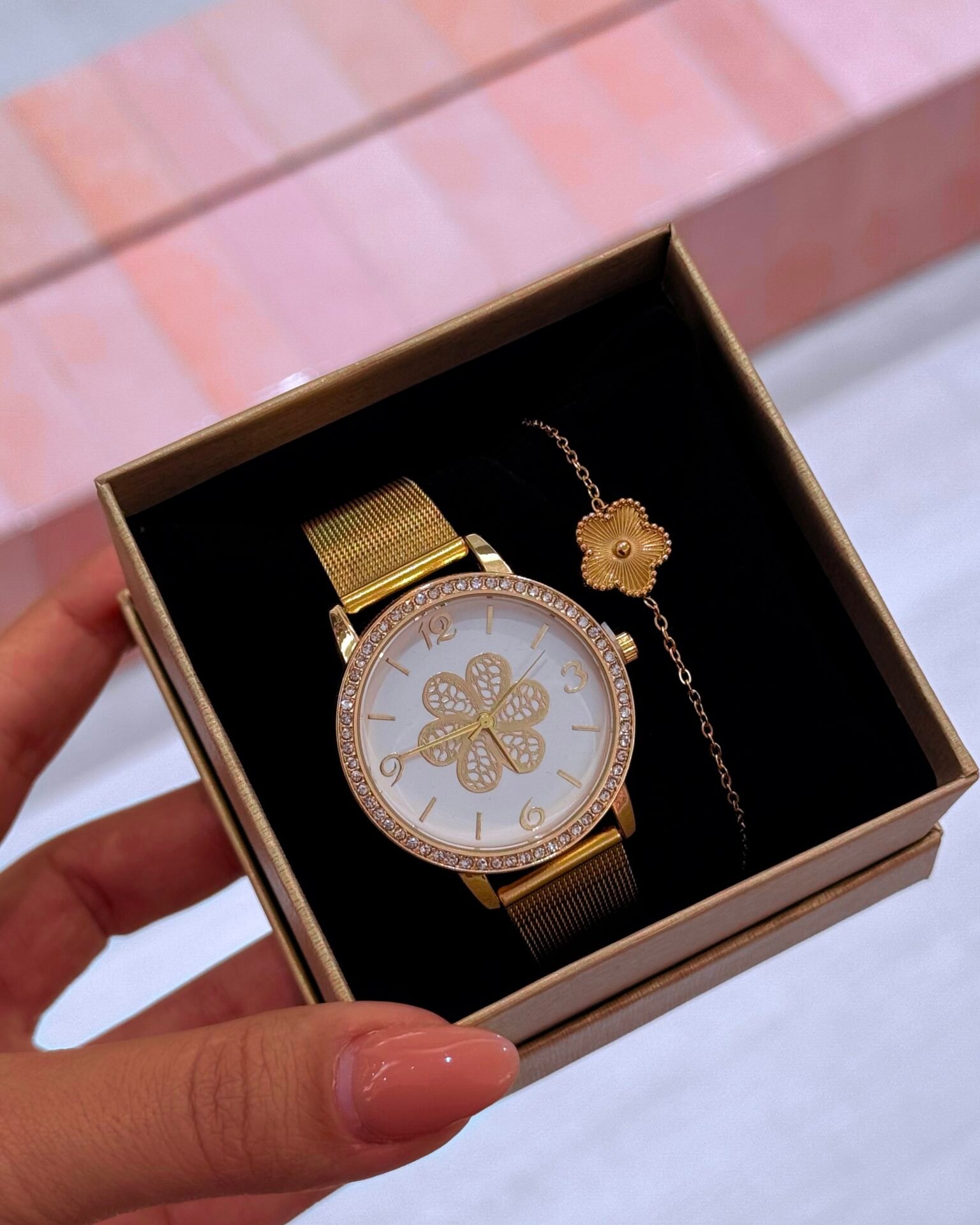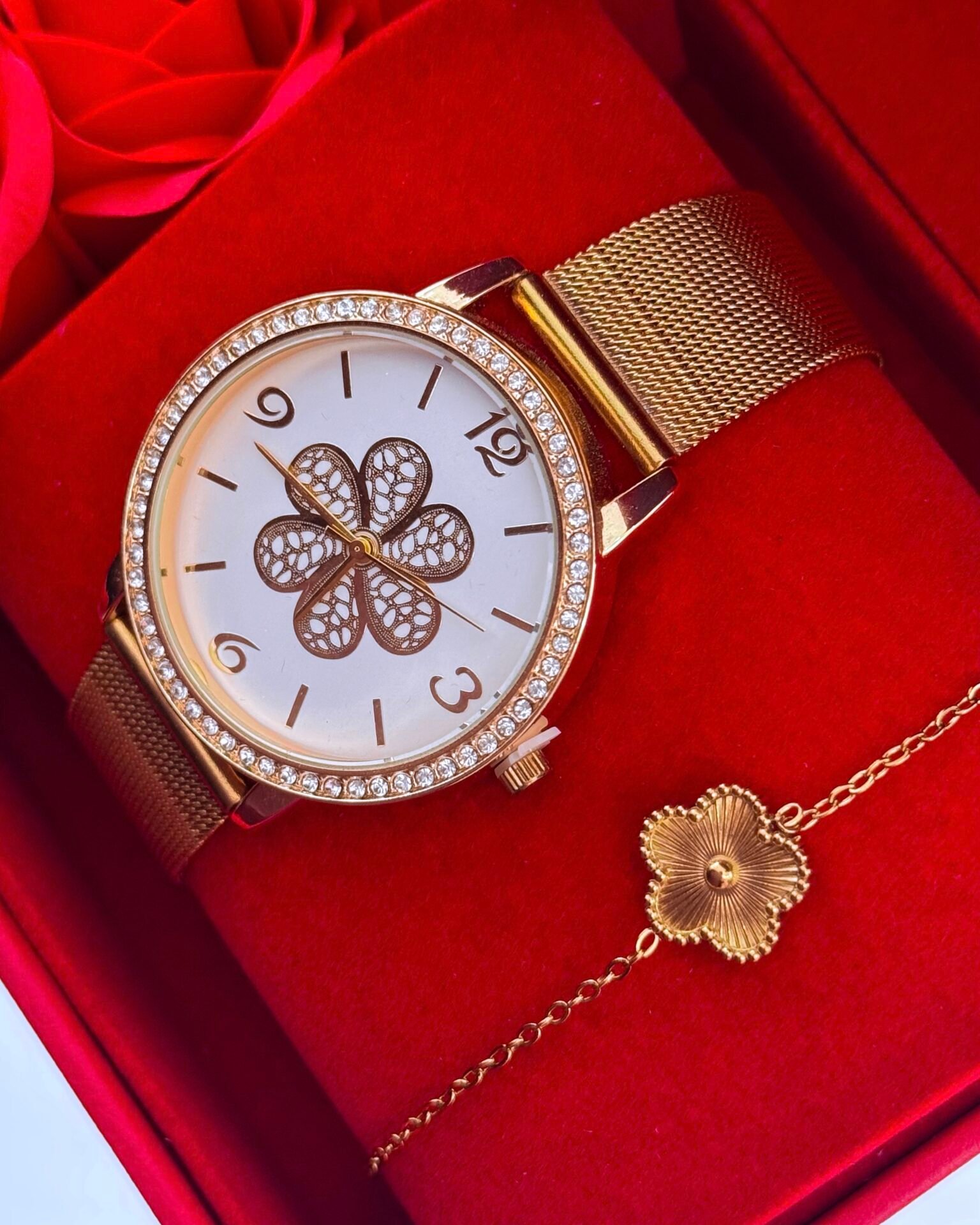 Um tributo à beleza que não precisa de palavras. O conjunto Bellisse une um relógio com mostrador rendado em forma de flor e moldura com brilho subtil, à pulseira delicada com flor — criando uma harmonia perfeita entre feminilidade, requinte e romantismo.