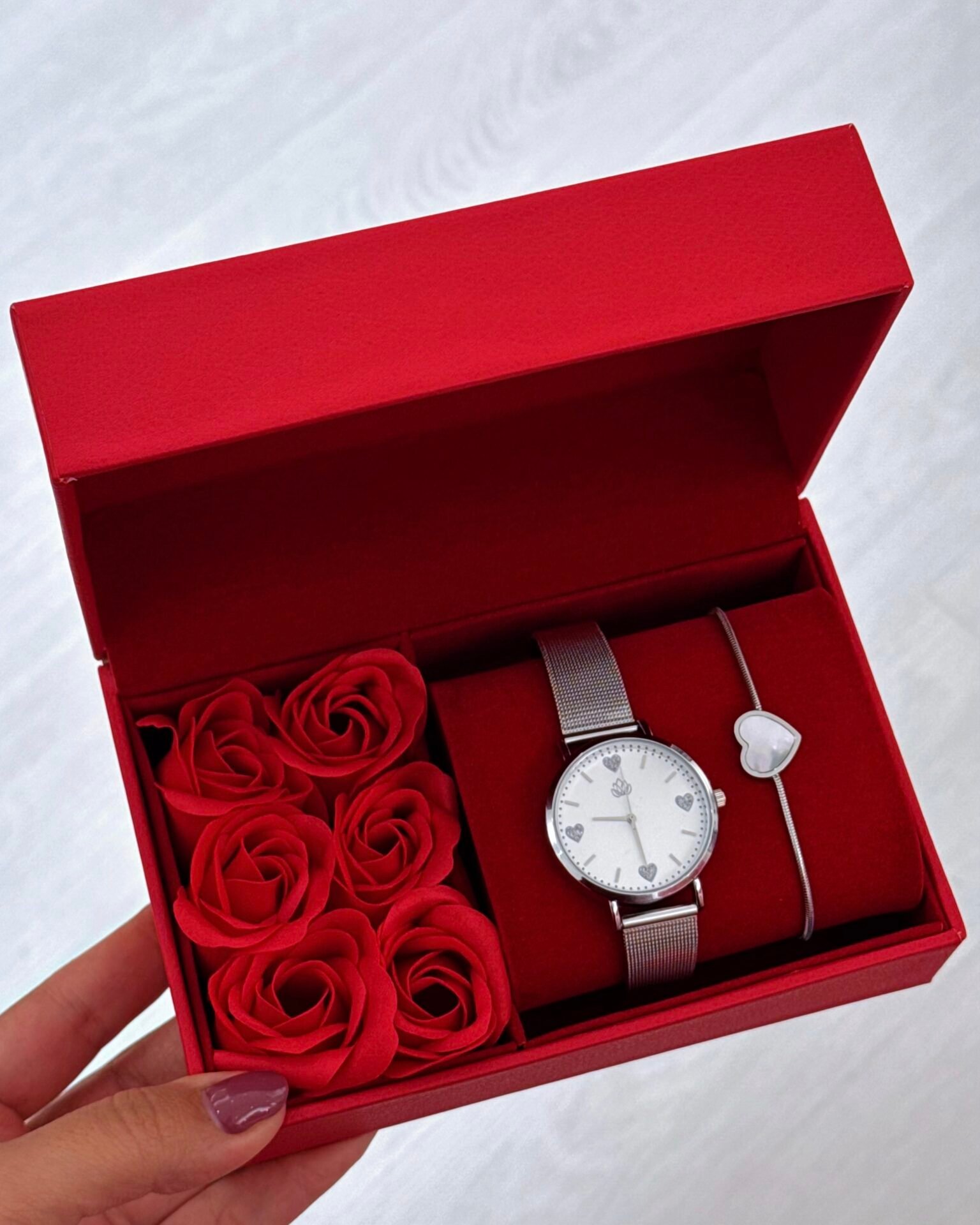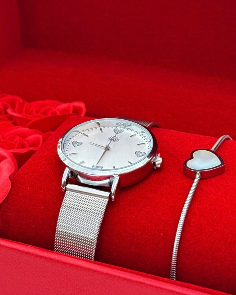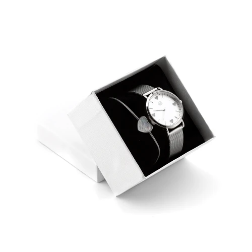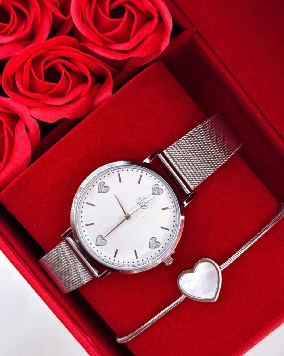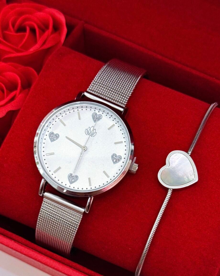 O Conjunto Coração de Névoa combina dois elementos simbólicos: o tempo e o amor. O relógio apresenta detalhes em forma de corações prateados sobre mostrador madrepérola, num contraste subtil que inspira ternura e confiança. A pulseira com coração central em madrepérola encerra o conjunto com um toque de leveza e emoção.