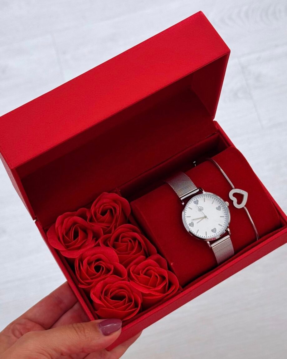 O Conjunto Douceur é um tributo ao amor em todas as suas formas — próprio, romântico ou familiar. O mostrador do relógio é pontuado por delicados corações prateados que marcam as horas com suavidade, como pequenos lembretes de que cada momento pode ser especial.