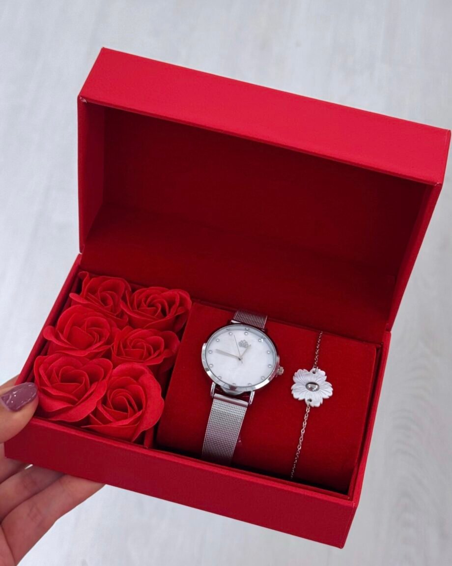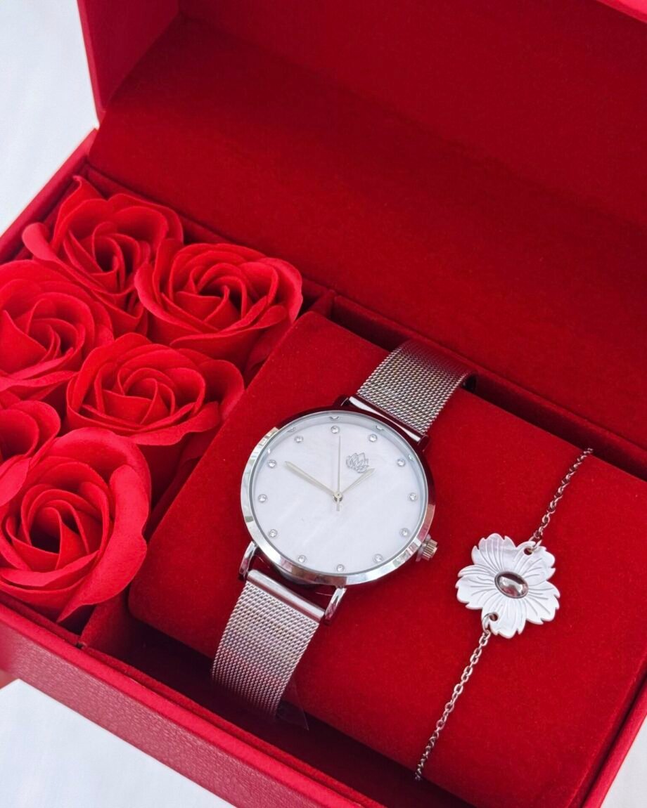 O Conjunto Lueur é a expressão da delicadeza feminina em forma de acessório. O relógio apresenta um mostrador em madrepérola com marcadores em cristal — cada ponto assinala o tempo com elegância e luz. A flor em acabamento nacarado na pulseira evoca a beleza efémera das flores ao sol, numa composição que exala romantismo, pureza e sofisticação.