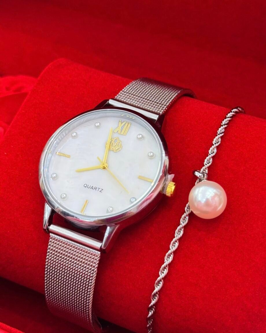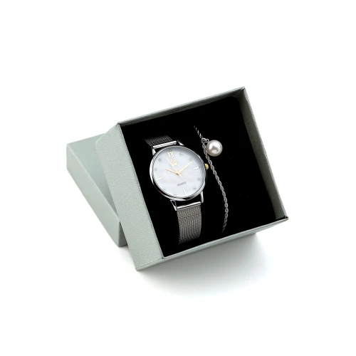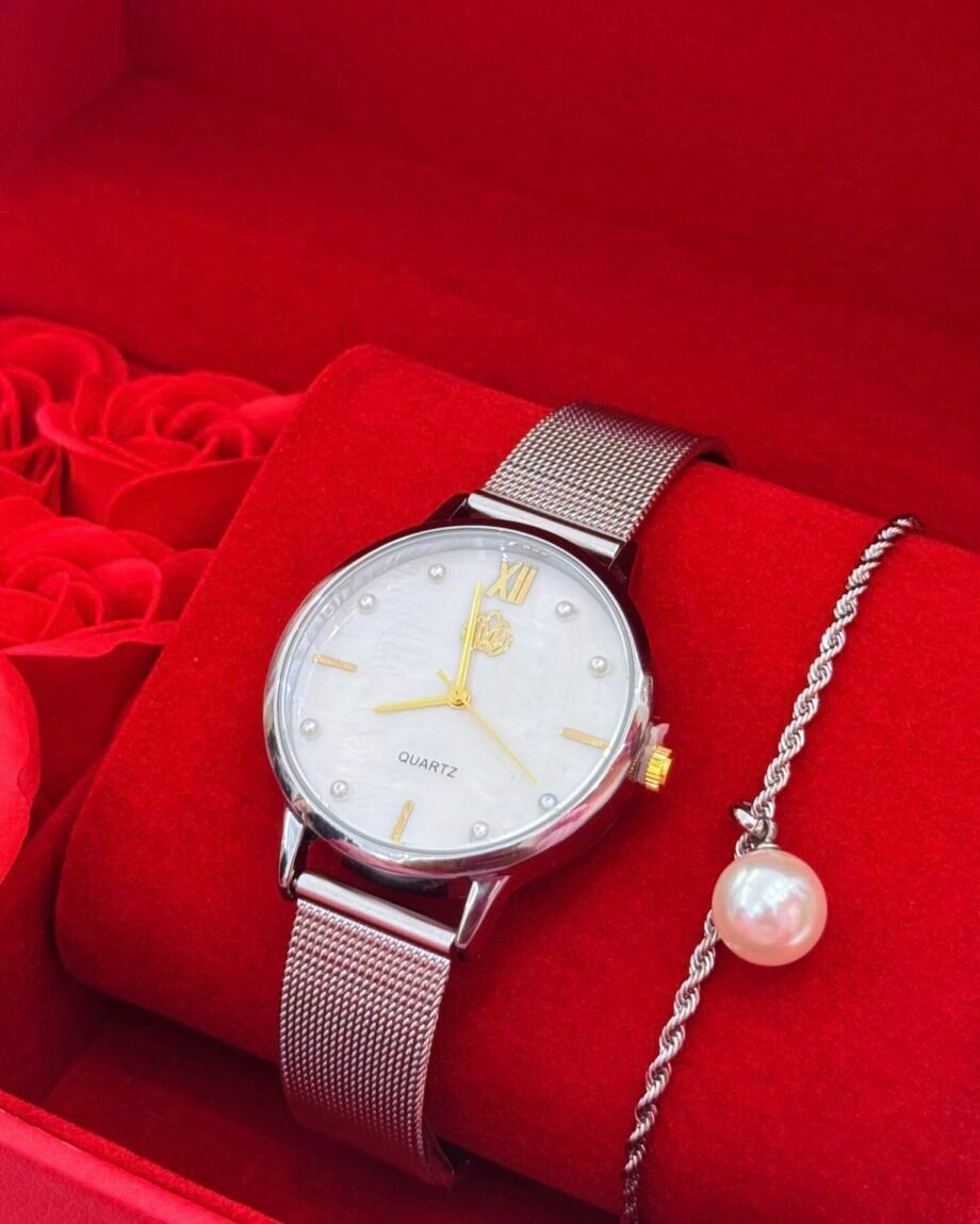 O Conjunto Perlaire combina um relógio de pulso com mostrador em madrepérola e marcadores de horas representados por pequenas pérolas — símbolo de elegância intemporal — com uma pulseira prateado adornada por uma pérola suspensa.